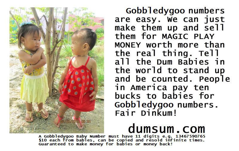Gobbledygoo Baby Numbers are the greatest thing since sliced bread.! Free introductory offer! Can immediately be copied and resold infinitely for $10 a piece or whatever! Suitable for use on Magic Play money you make yourself, worth more than the real thing!